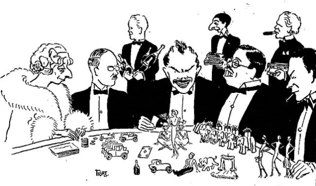 1931 The Big Baccarat Table in Nice (France) was sketched by cartoonist, Pierre de Régnier, aka Tigre (1898-1943), and ran in newspapers with this description: “From left to right: Mme. Ephrussi, the French multimillionaire widow who lives at the gaming tables; Andre Citroen, the rich automobile manufacturer, whose fortune represents motor cars; Yves Mirande, the…