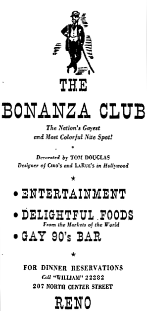 * The Bonanza Club was located at 207 N. Center Street, Reno. The property today is part of Harrah’s Reno Hotel and Casino.