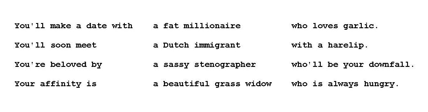 These fortunes and statements were what appeared in the display of a particular slot machine when one read the whole reel from left to right. Short three- to five-word phrases replaced the typical fruit or other symbols.